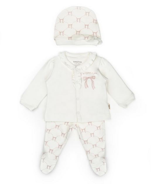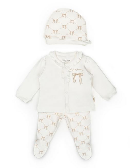 The Bow & Blossom 3-Piece Baby Set from our Baby Cosy Organic Collection is designed to make dressing your little one effortless, elegant, and comfortable. This thoughtfully coordinated set includes a ruffled cardigan with delicate embroidered bow details, cozy footed pants, and a soft matching hat, creating a perfectly styled outfit from head to toe. Crafted from 100% organic cotton interlock, each piece is breathable, durable, and exceptionally gentle on sensitive newborn skin. The cardigan features charming ruffle accents and embroidered bows for a timeless look, while the footed pants keep tiny feet warm without the need for socks. The matching hat completes the set, providing light warmth and comfort. Ideal as a take-home outfit, baby shower gift, or everyday essential, the Bow & Blossom set offers parents peace of mind through high-quality materials and practical design without sacrificing style.