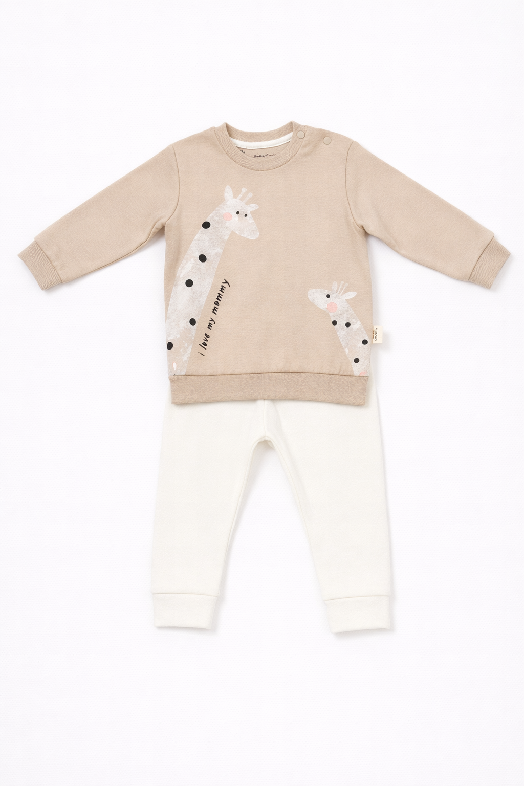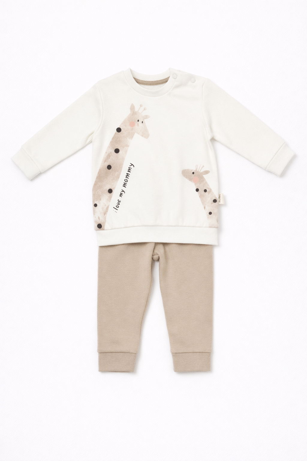 The Little Safari Pants & Long Sleeve Top Set from our Baby Cosy Organic Collection brings playful charm and everyday comfort together in one thoughtfully designed outfit. Crafted from 100% organic cotton interlock, this set is exceptionally soft, breathable, and gentle on delicate skin, ideal for all-day wear, playtime, and cozy moments. The long-sleeve top features an adorable giraffe motif with embroidered details, adding personality and warmth without compromising comfort. The coordinating pants are designed with a relaxed fit to allow easy movement for crawling, exploring, and growing little adventurers. Finished in a soothing sand and neutral color palette, this set is perfect for everyday wear while still looking polished and put-together. A versatile essential designed for comfort, durability, and effortless style.